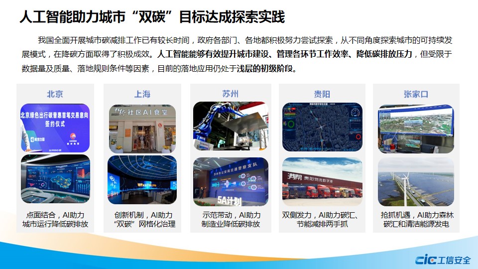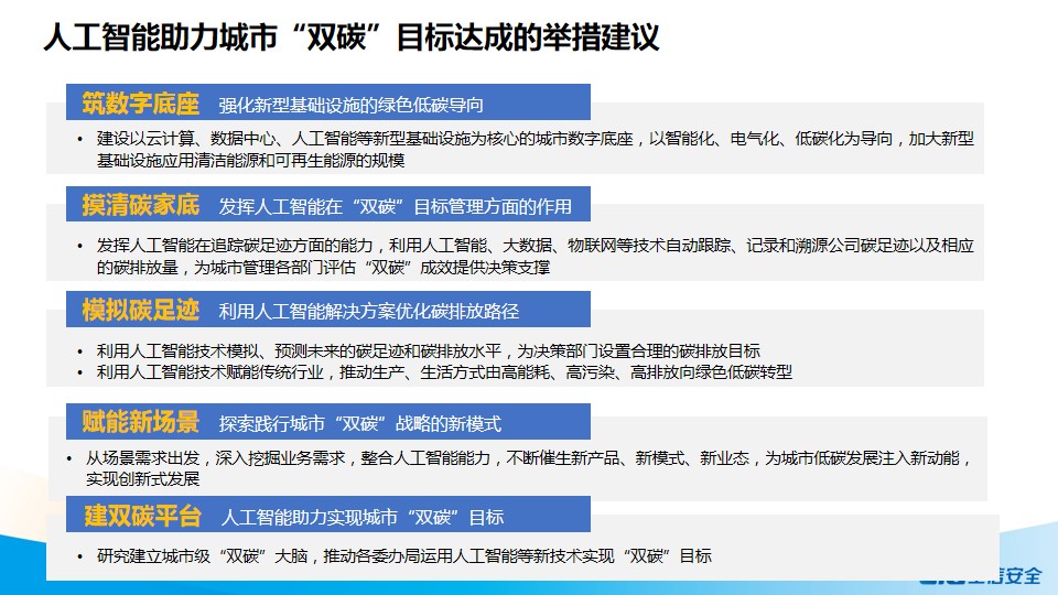 白皮出指出,我国目前已有多个城市在人工智能助力城市“双碳”目标达成方面进行了积极探索,取得了一定成效,但未来仍需进一步深化发展:要筑数字底座,强化新型基础设施的绿色低碳导向;要摸清碳家底,发挥人工智能在“双碳”目标管理方面的作用;要模拟碳足迹,利用人工智能解决方案优化碳排放路径;要赋能新场景,探索践行城市“双碳”战略的新模式;要建“双碳”平台,推动各委办局积极运用人工智能等新技术实现“双碳”目标。