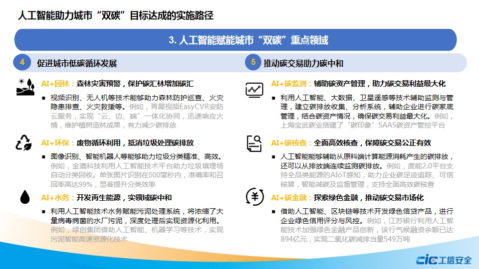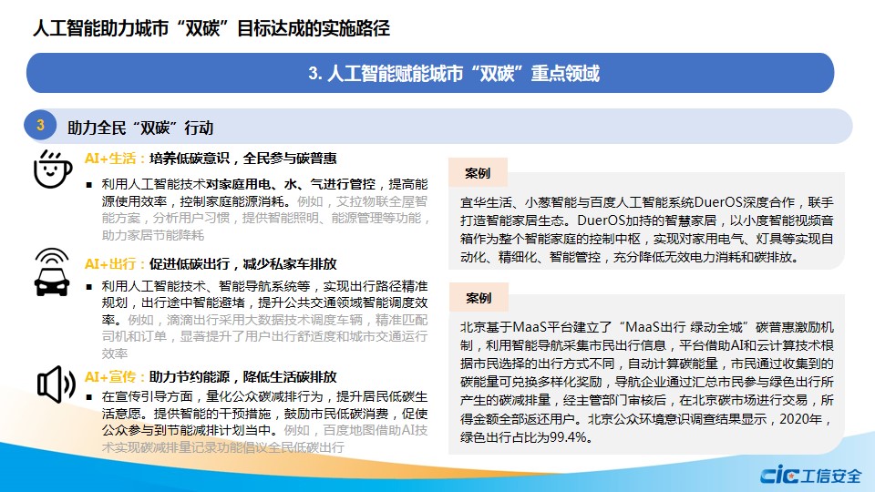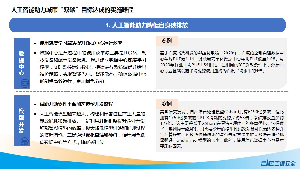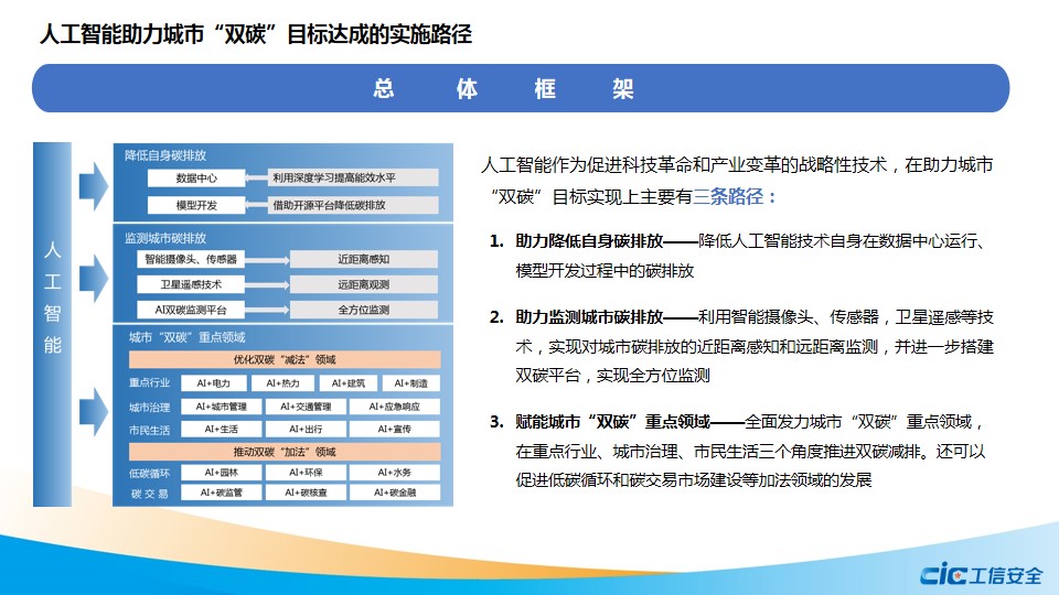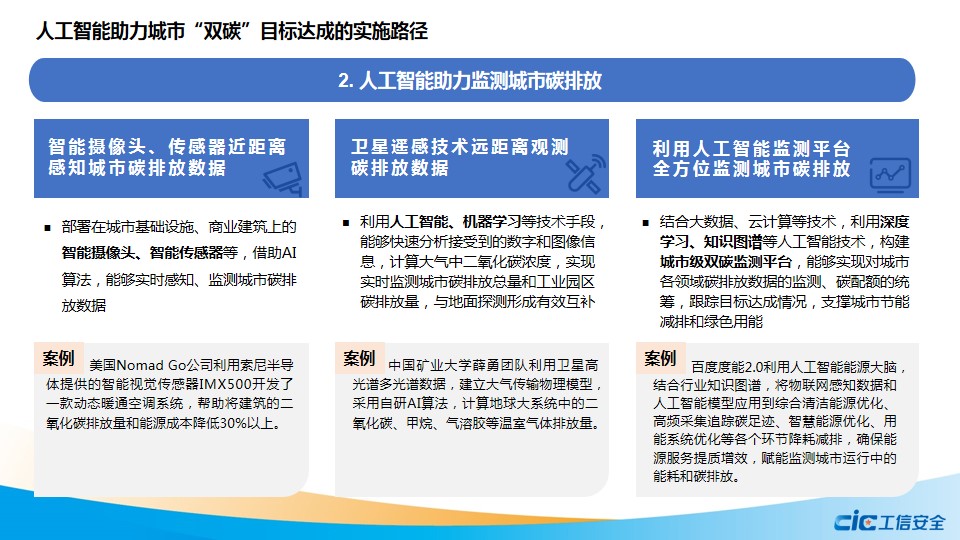 白皮书提到,人工智能主要通过三大路径助力城市落实“双碳”目标:一是助力降低自身碳排放,利用深度学习算法、开源平台等降低人工智能技术自身在数据中心运行、模型开发过程中的碳排放;二是助力监测城市碳排放,通过智能传感器近距离感知、卫星遥感远距离观测,利用人工智能监测平台对城市碳排放进行综合分析,能够实现对碳足迹的跟踪、学习、模拟等,有效助力城市预测和优化碳排放活动;三是赋能城市“双碳”重点领域,通过赋能重点行业、城市治理、市民生活三个维度推进碳减排,通过促进低碳循环和碳交易市场建设增加碳吸收、实现碳中和。
