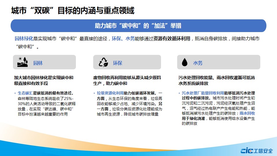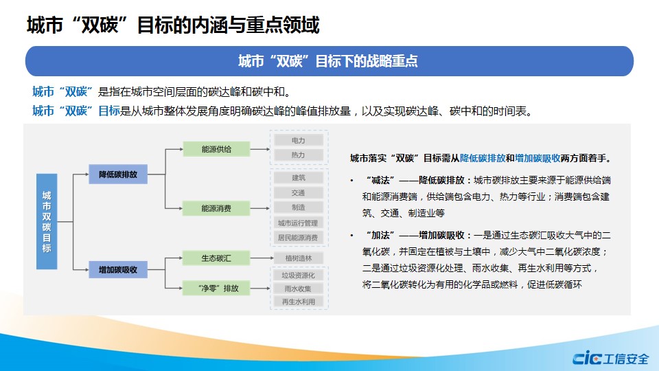 白皮书认为,城市“双碳”目标是指城市空间层面的碳达峰和碳中和,它要求从城市整体发展角度明确碳达峰的峰值排放量,以及实现碳达峰、碳中和的时间表。落实城市“双碳”目标需要做好“加减法”,一方面是做好落实碳达峰的“减法”,即从能源供给和能源消费两端降低碳排放,推动能源、交通、建筑、制造等高耗能、高排放行业的节能降耗;另一方面是做好落实碳中和的“加法”,即通过推动生态建设、加大园林绿化,提高环保、水务资源的循环利用提升生态碳汇,增加碳吸收,实现“近零排放”。