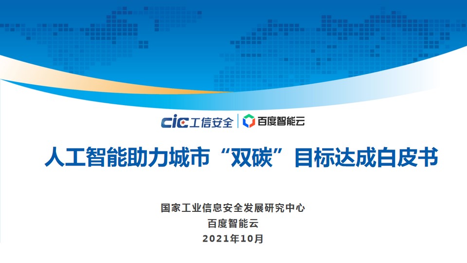 10月16日,在苏州举行的“第二届两化融合暨数字化转型大会”人工智能论坛上,由国家工业信息安全发展研究中心和百度智能云联合撰写的《人工智能助力城市“双碳”目标达成白皮书》(以下简称“白皮书”)正式发布。白皮书以“双碳”战略为背景,梳理了城市“双碳”目标的内涵和重点领域,分析了人工智能助力城市“双碳”目标达成的路径及主要城市的探索实践,并提出了相应的举措建议,旨在为发挥人工智能的最大效能,驱动城市绿色低碳发展提供参考。